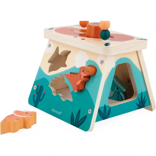 Дерев'яний багатофункціональний куб-активатор з колекції "Динозаври" французького бренду Janod розвиває у дитини багато ключових навичок, серед яких: розрізнення та зіставлення форм або т. зв має дрібну моторику. Набір складається з дерев'яного блоку у формі вулкана (з трапецієподібними сторонами), на якому, серед іншого, є: шестерні, дзеркало, сортер для незвичайних форм (динозаврів) і на верхній стінці петля з 8 дерев'яними намистинами для пересування та доріжкою з блоком для пересування з зображенням сліду динозавра. Витягти вставлені блоки зсередини дуже легко, тому що одна сторона вулкана частково відкрита.