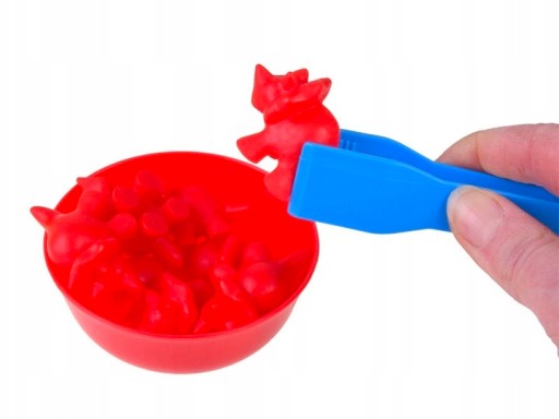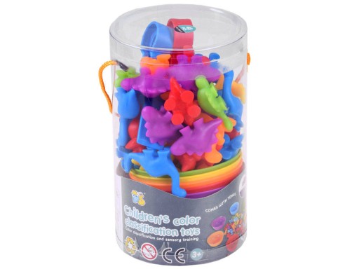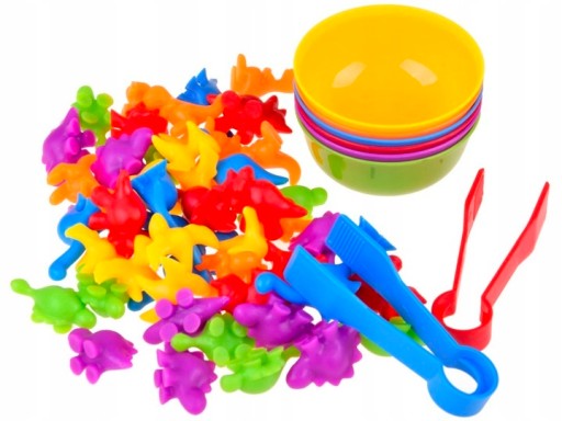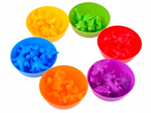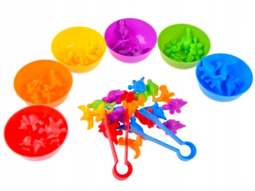 Висипаємо всіх динозаврів і змішуємо, потім розставляємо миски. Завдання дитини - пінцетом розсортувати динозаврів і помістити відповідний колір у відповідну миску.