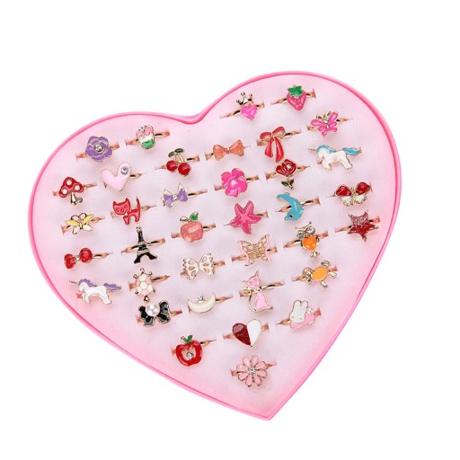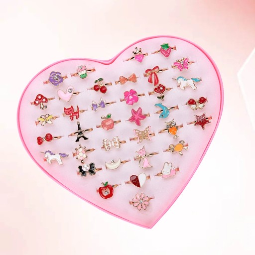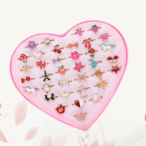 Дизайн каблучок із сплаву з 36 елементів, які зачарують ваших дітей. Сердечко, метелик, квітка та багато інших різнокольорових діамантових візерунків, дуже гарно. Можна використовувати як наповнювач для подарунків на день народження, наповнювач для піньяти, уявне чаювання, карнавал, скриню зі скарбами тощо.