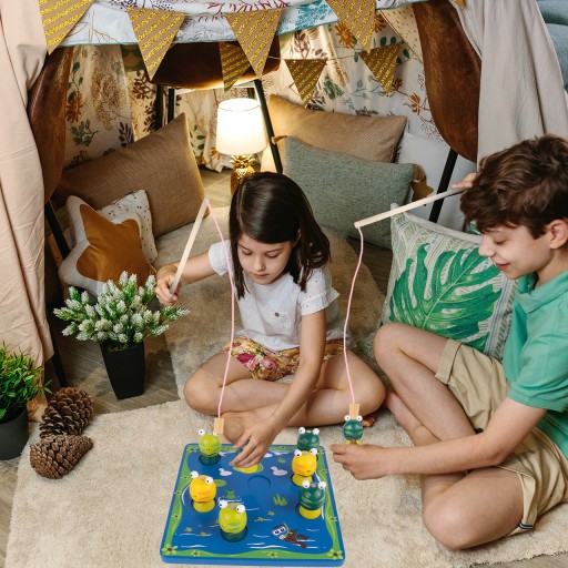 Гра на спритність полягає в тому, щоб ловити та діставати жаб, розташованих на дерев’яній основі. На вудку можна ловити рибу, в голові якої є магніт.