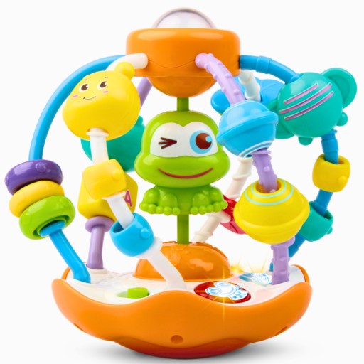 Мила жабка весело кліпає очима, красива кулька з намистинами для обертання, крихітне безпечне дзеркальце боязко спокушає, а веселі звуки тварин, мелодії, кольори та вогники!