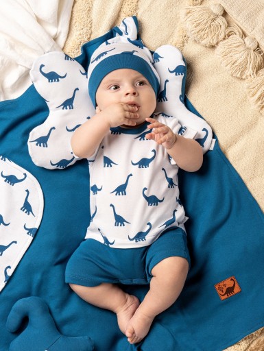 Комбінезон для хлопчика темно-синього кольору з 100% повітряної бавовни. Висока якість матеріалу підтверджена сертифікатом Oeko-Tex Standard 100 Trustworthy Textiles. Повзунки мають вільний крій і трохи занижену талію для розміщення підгузника, мають широкий шнурок на талії, що не тисне, що забезпечує повний комфорт малюка.Спереду прикрашена нашивкою динозавра.