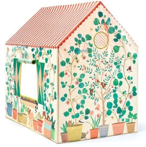 Фантастичний барвистий намет із серії Little Big Room від Djeco. Цей красивий дитячий намет у формі справжнього будиночка вміщає 1-2 дітей від 3 років. Котедж чудово ілюстрований. Навколо нього багато горщиків з лозою, на підвіконнях — розсада. У цьому казковому середовищі ховаються тварини. Вікна та двері мають біло-зелені фіранки зі шнурками, які можна відкрити.