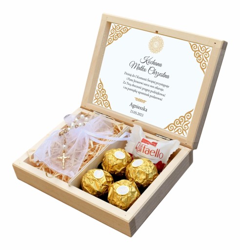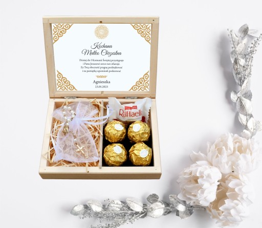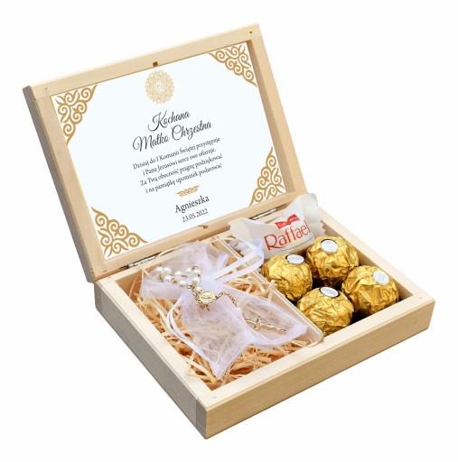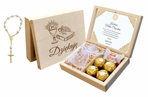 Виготовлена коробкавиготовлена з натурального дерева. Разом з гравіюванням виглядає чудово. Крім того, декоративний папір додає вражаючого вигляду. Коробка прикрашена чудовою подякою, іменем дитини тадата Першого Святого Причастя або Хрещення.