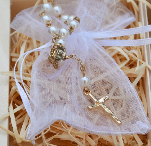 У коробці однодесяткові чотки, упаковані в пакет з органзи.