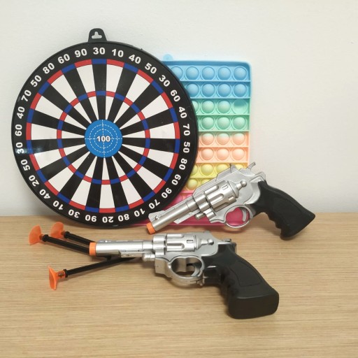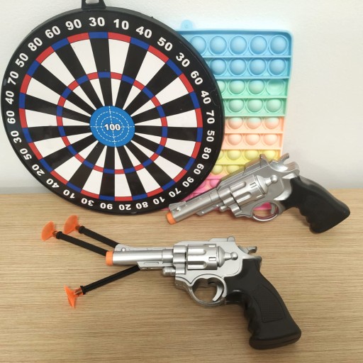 У набір входять щит, два пістолети і три безпечні дротики. Цей набір дозволить вам зіграти в справжній шутер. Вся річ виготовлена з якісних матеріалів, завдяки чому гарантує чудове задоволення протягом тривалого часу!