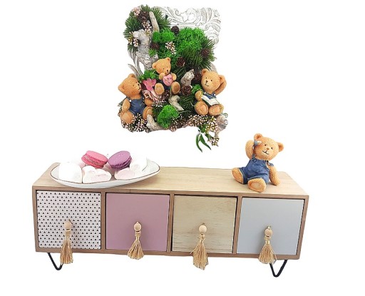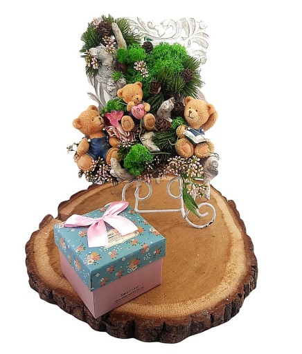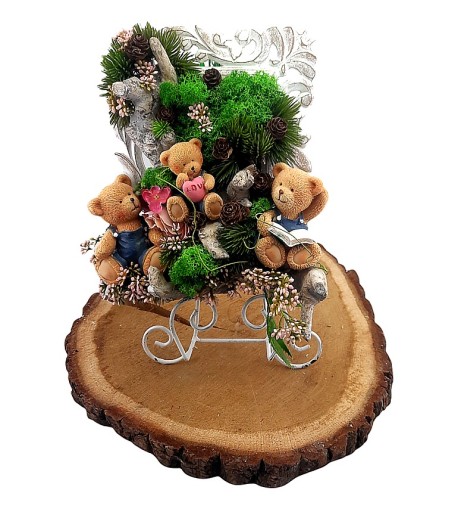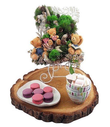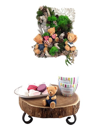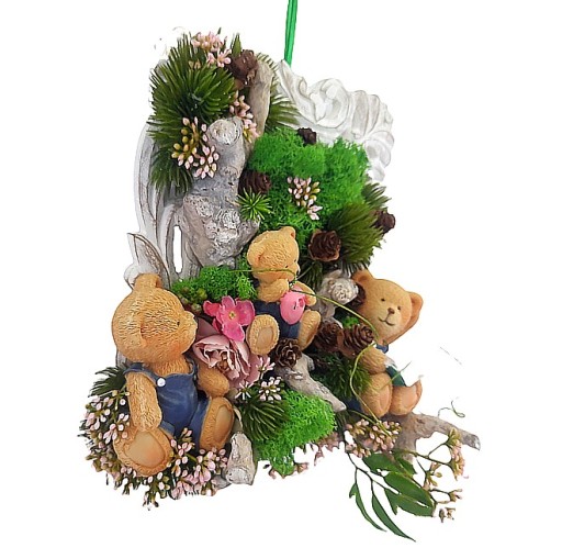 Він прикрашений маленькими плюшевими ведмедиками, ніжними квітами, зеленими гілочками, маленькими шишками та натуральною марлею.