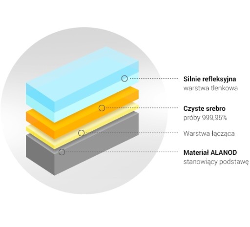 синій колір - Оксидний шар з високою відбивною здатністю помаранчевий колір - 999,95% чисте срібло жовтий колір - сполучний шар сірий колір - матеріал ALANOD, що становить основу.