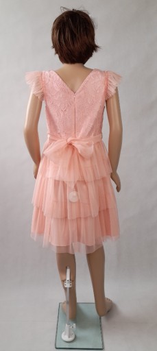 Пудрово-рожева сукня для дівчинки Короткі фатинові рукави метелики, які красиво прикривають плечі дівчинки. На талії додатковий пояс, який зав'язується бантом ззаду, що є додатковою перевагою сукні, як декоративною, так і практичною, оскільки забезпечує комфортне носіння дівчатам з різним типом талії. Сукня має гарний крій і ідеально струмує під час танцю, що оцінить кожна дівчина, яка хоче хоч на мить відчути себе принцесою. Д сукні з фатину, мереживо грають. Сукня має підкладку, завдяки якій нічого не видно. Сукня ідеально підходить для особливих випадків: причастя, прийому, весілля чи хрещення. Польський продукт.