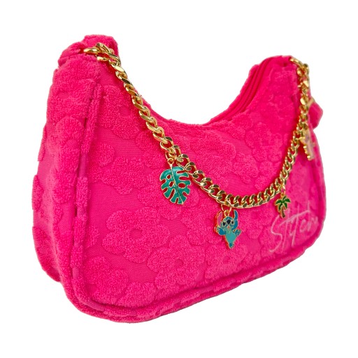 Сумка м'яка і жорстка по краях. На тканині нашиті дрібні пухнасті квіти. Золотий ланцюжок з підвісками - Стіч, Андзі, пальма і лист додає шарму. Всі металеві елементи в сумці золоті.