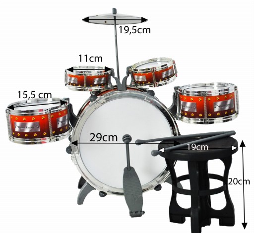 Набір не міг пропустити адаптований табурет, який характеризується висотою, що відповідає самій перкусії та зросту дитини. Весь виглядає точно так само, як прототип, тим більше, що колір інструменту нетиповий для дітей. Завдяки цьому барабани також будуть цікавим елементом обладнання кімнати, і дитина із задоволенням буде хвалитися ним перед однолітками.