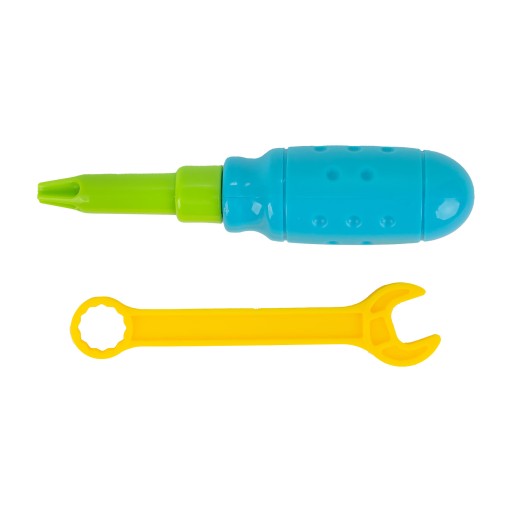 Тільки наш конструкторскладається аж з 250 елементів. У набори входять багатогранні пластини, кутники, гвинти, гайки, дюбелі, викрутка,гайковий ключ і викрутка (на батарейках)який працює в режимі загвинчування і викручування і має два змінних наконечника - плоский і хрестоподібний.