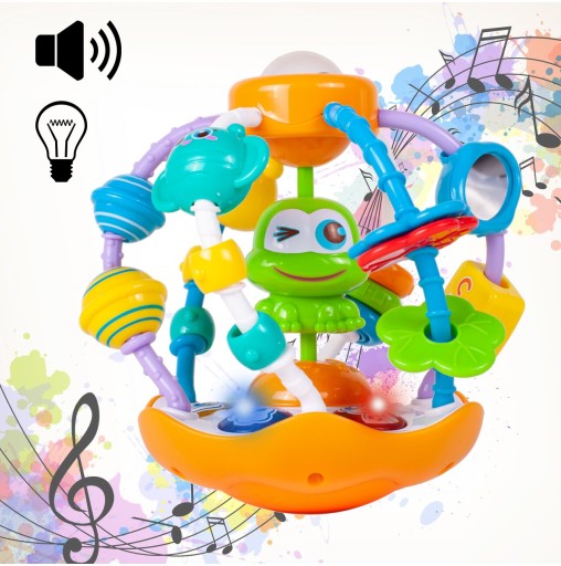 Чарівне маленьке жабеня радісно кліпає очима, красива кулька з намистинами, які можна обертати, маленьке безпечне дзеркальце несміливо спокушає, а веселі звуки тварин, мелодії, кольори та вогники!