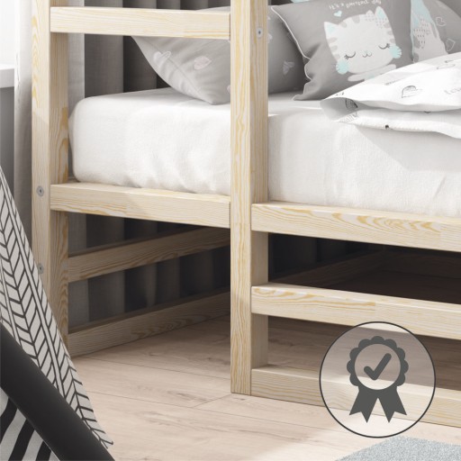 KAME - це дуже цікава пропозиція для дитячої кімнати з широкими можливостями облаштування. Це двостороння модель. Спальне місце може бути на першому поверсі з доступом по сходах, що також дає можливість створити простір для ігор або зберігання в нижній частині. Інша альтернатива – використовувати додатковий матрац і використовувати два спальні рівні. Після перевертання блок перетворюється на низьке коло з поперечиною зверху для декорування тематичними декораціями чи підсвічуванням. Стильний, скандинавський характер доповнюється можливістю придбання верхніх елементів, що імітують модну форму даху.