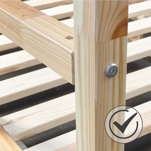 МАКСИМАЛЬНЕ НАВАНТАЖЕННЯ: 100 кг МАТЕРІАЛ: масив сосни, металеві шурупи, з'єднувальний елемент для основи матраца - поліефірна стрічка.