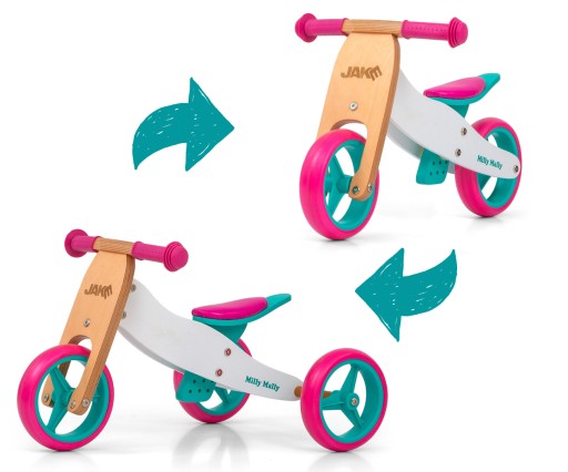 Неоціненною перевагою є можливість переробити його з триколісного велосипеда на двоколісний бігунок. Завдяки цьому ваша дитина зможе довше насолоджуватися цим незвичайним велосипедом, який «росте» разом з ним. М'які неслизькі ручки з чохлами захистять руки дитини, а регульована висота сідла дозволить підлаштувати відповідну висоту під зріст дитини. Також є обмежувач повороту, щоб дитина не крутила кермо, заважаючи йому їхати.