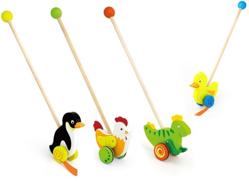 Ось ще один компаньйон для спільної прогулянки. Дитина хапає палицю і штовхає пташку перед собою. Ніжки пташки зроблені з гуми, і вона смішно каркає, коли її штовхають.
