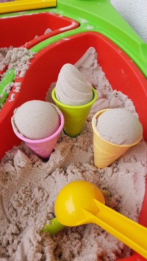Додавши в нього воду, можна робити кекси, будувати складні замки та інші форми з піску. Він ідеально підходить для творчих ігор вдома в дощові дні.