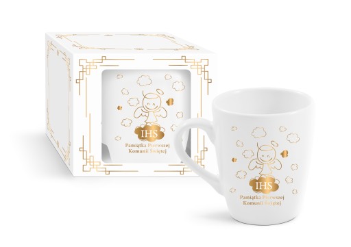 Біла керамічна чашка з золотим металевим принтом "IHS Souvenir of the First Holy Communion"