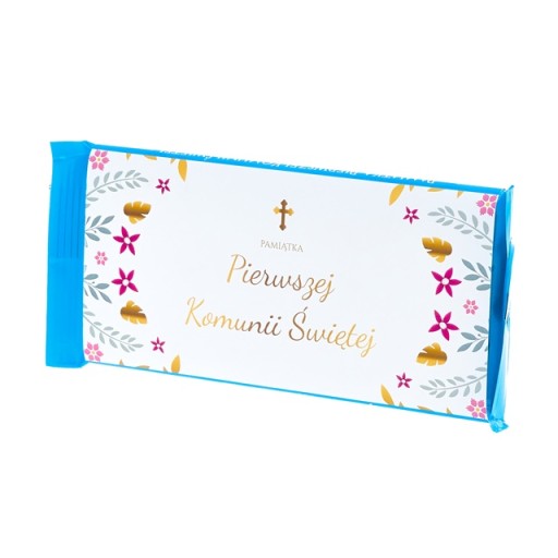 Молочний шоколад для Першого Святого Причастя. Упаковка прикрашена вишуканим ніжним принтом. Цікаве доповнення до подарунка до Причастя.
