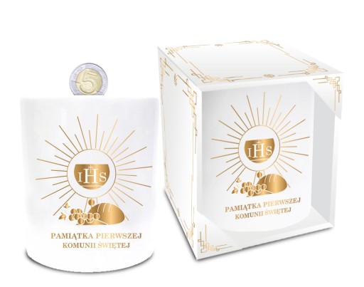 Біла керамічна скарбничка у формі циліндра з золотистим написом «IHS Souvenir of the First Holy Communion».
