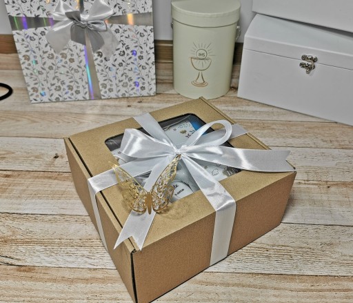 У набір входить скарбничка з металевим принтом 'IHS Сувенір Першого Святого Причастя»молочний шоколад, сувенір на підставці для листівок.