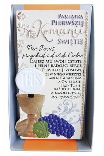 Пам’ятна дошка з нагоди Першого Святого Причастя з написом «Господь Ісус сьогодні приходить до тебе. Ти віддай Йому своє чисте й радісне серце. Скажи Ісусу, що ти віриш в Нього і що ти глибоко любиш Його. І Він буде з тобою кожен день, кожну мить назавжди!». Табличку можна розмістити або повісити.