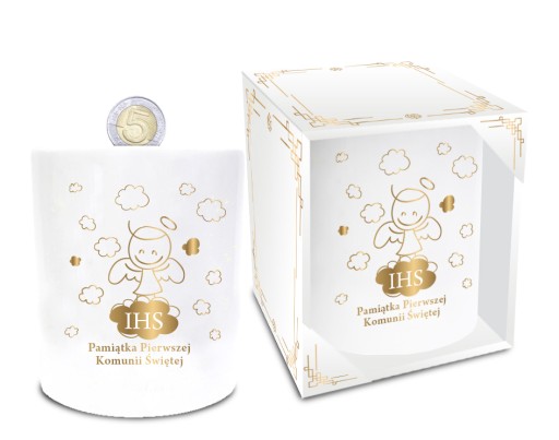 Біла керамічна скарбничка у формі циліндра з золотистим написом «IHS Souvenir of the First Holy Communion».