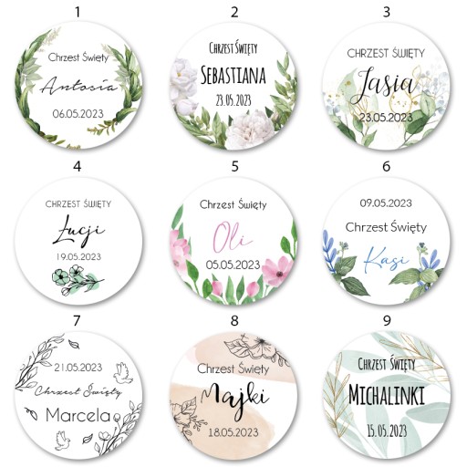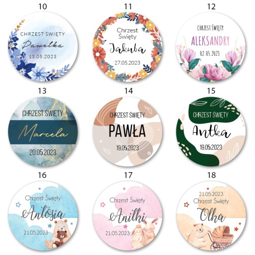 Наклейки — ідеальний продукт, який дозволяє легко створювати персоналізовані елементи на святі Хрещення. Ними можна прикрасити конверти із запрошеннями, подарунки для гостей, такі як цукерки, льодяники; їх можна приклеїти на коробку для торта або на листівки. Також стікерами можна покрити елементи, які ми розміщуємо на столі, наприклад, графини для води, вази, пляшки, підсвічники, серветниці, чашки або будь-які інші плоскі поверхні, завдяки чому стіл набуде неповторного, урочистого характеру.
