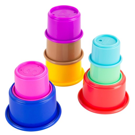 У наборі 8 чашок різного розміру, позначених цифрами. На дні кожної чашки є отвори різної форми. Діти молодшого віку можуть грати в пірамідки, а дітям старшого віку стаканчики допоможуть навчитися рахувати.