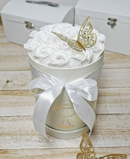 Квіткова коробка з принтом IHS, наповнена ароматним милом у формі троянди.