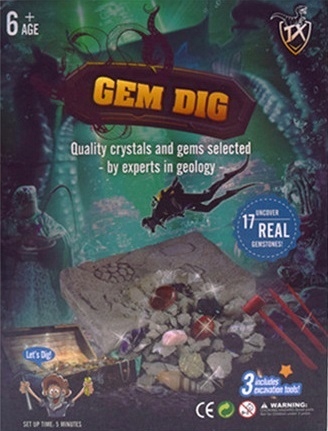 У набір входить сибіряка розміром 17х11х3,5 см, в якій заховані різні діаманти і кристали, які можна викопати. Якщо ви хочете видобути скам’янілості, ви повинні використовувати спеціалізовані інструменти, щоб не пошкодити знахідки. Вам потрібно буде бути надзвичайно делікатним, терплячим і точним, щоб відкопати всі скарби - їх 17! Можливо, у майбутньому ваша дитина теж захоче здобути цю цікаву професію? :)