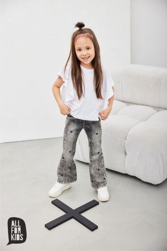 Штани виготовлені з джинсового матеріалу графітового кольору. Штанини мають розширені штанини. М'яка гумка на талії. Ззаду кишені.