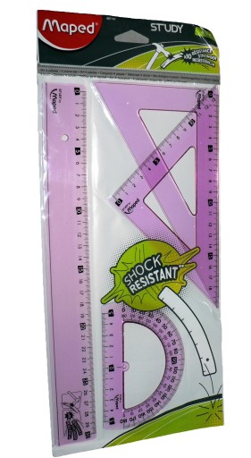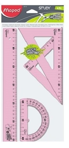 Міцні та гнучкі лінійки STUDY, у 10 разів більш стійкі до зламів, ніж стандартні лінійки. Незмивна накип, стійка до УФ-випромінювання. Заокруглені кути. Одностороння шкала. Прозорий рожевий і блакитний кольори, колір надсилається випадковим чином. У набір входить лінійка 30 см, 2 косинця і вимірювальний прилад.