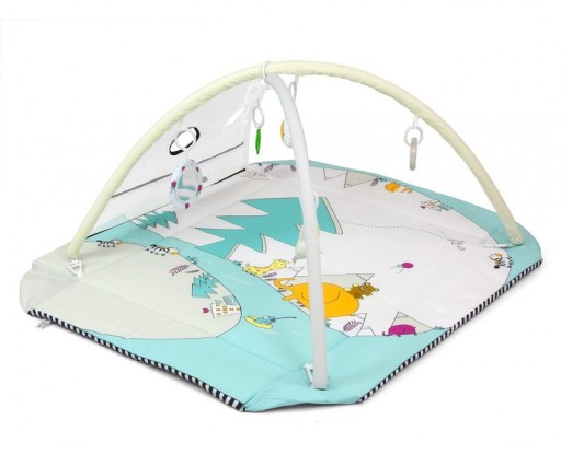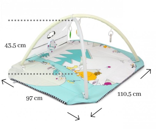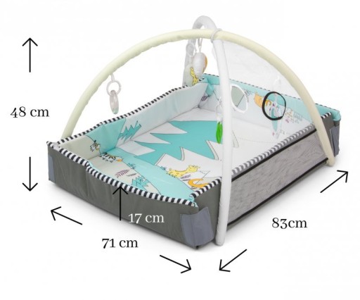 Іграшки можна вільно вішати як на штанги, так і на килимок (є спеціальні гачки, що дозволяють кріпити їх у кількох місцях).Кожна з іграшок таїть в собі привабливість,які позитивно впливають на розвиток дитини, стимулюючи її органи чуття.Плюшеві талісмани приховують пищалку або брязкальцеякі стимулюють відчуття дотику, слух і зір.Кругла зручна брязкальце ховає різнокольорові кульки- що зацікавить кожного малюка, а безпечне дзеркало стимулює зір. З іншого боку, пластикова іграшка зі вставками стимулює дотик і зір.