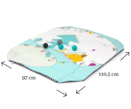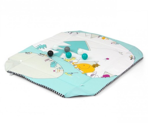 Килимок був укомплектований5 цікавих іграшок,якими можна грати самостійно. Крім того, в сітці, яка має кишеньку для м'ячів, єдва отвори, через які можна кидати м'ячі.