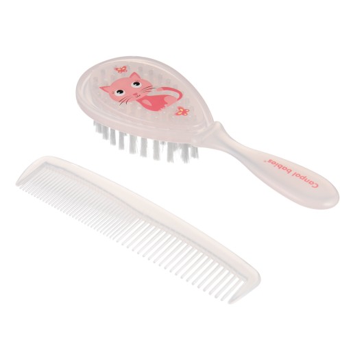 Гребінець має закруглені зубчики, які не дратують чутливу шкіру малюка. Щітка з жорсткою штучною щетиною ніжно масажує голову малюка, не електризуючи волосся. Набір доступний в декількох колірних варіантах.