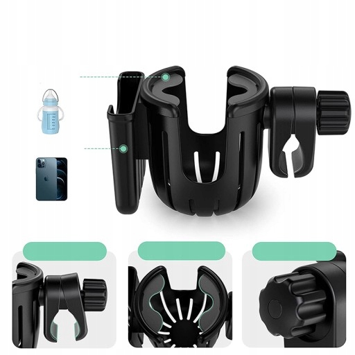 Тримач підходить для більшості колясок і може вмістити всі типи телефонів і ємності для напоїв: пляшки, пляшки з водою, термоси, кухлі - все підійде ідеально!