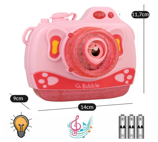 Щоразу, коли машина надуває бульбашки, вона видає звуки, схожі на фотографування. Додатковою привабливістю є миготливі світлодіоди, розташовані в корпусі камери. З такою кількістю цікавих варіантів у вашому розпорядженні ваша дитина точно не захоче з нею розлучатися.