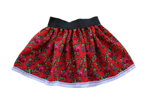 Червона спідниця в народному стилі з красивим білим бавовняним мереживом внизу. На талії є резинка, яка добре тягнеться, щоб нічого не тиснуло. Спідниця плісирована, тому вона красиво «крутиться», що сподобається маленьким леді.