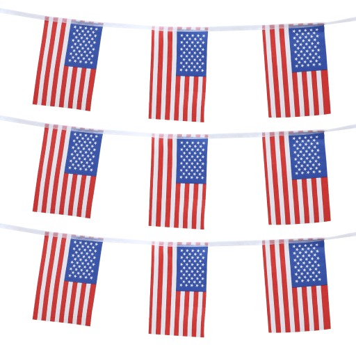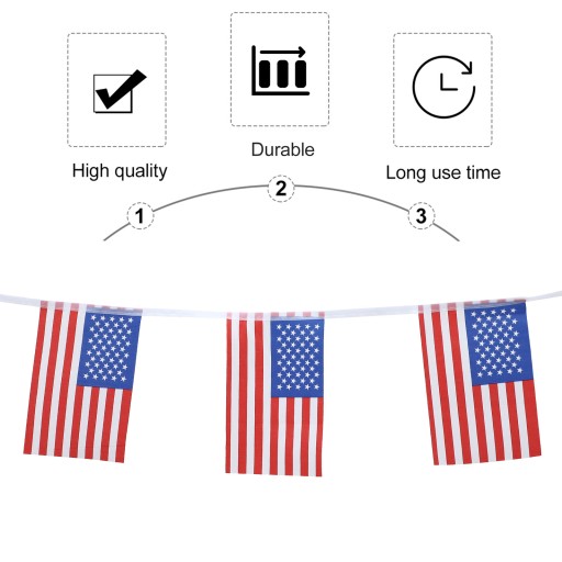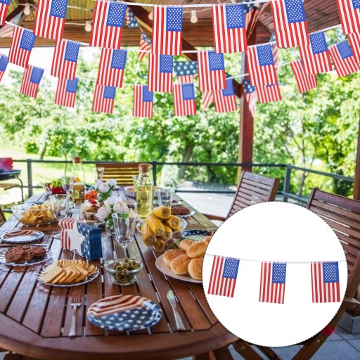 Цей рядок банерів із американським прапором — чудовий реквізит для фотографій, яким ви можете робити фотографії та ділитися ними з родиною та друзями. За допомогою достатньо міцного шнура легко повісити банери де завгодно. Ви можете повісити їх на стіну, над дверима або вікном, над столом, уздовж коридору або як фон на тематичній вечірці.