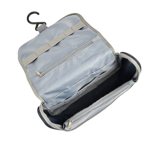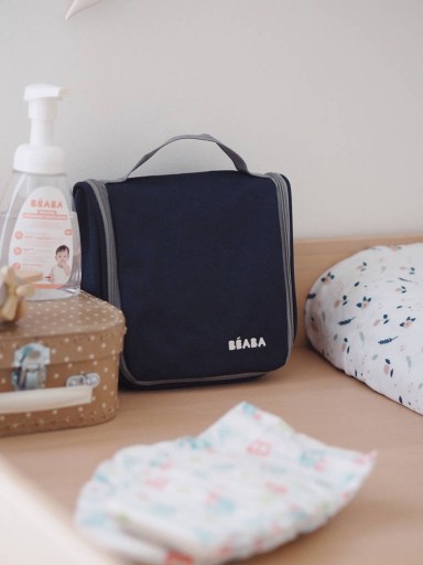 Косметичка для дитячих аксесуарів від французького бренду BEABA, красивого темно-синього кольору. Застібається на довгу блискавку, посередині міцна ручка для зручного перенесення. Окрім місткої основної кишені, він має одну зовнішню кишеню ззаду, дві внутрішні кишені на блискавці та два ряди широких гумок (5 на клапані та 4 в основному відділенні), що сприяє стабільному розподілу аксесуарів. Поворотний гачок дозволяє повісити косметичку у ванній або на туалетному столику.