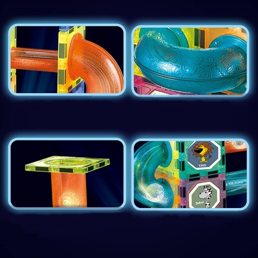 - У набір входять плоскі панелі, трубочки, кульки та наклейки. Різнокольорові кулі з підсвічуванням і яскраві прожектори вносять різноманітність у розваги, створюючи ефект доріжки, що світиться.