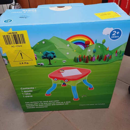 Увага!!! Пісок і вода, не повний комплект, відсутня одна синя ніжка столу. Інші елементи іграшкової лопатки, граблі, ситечка та наклейки входять. Стіл може мати незначні транспортні подряпини на пластику. Стіл в потертій оригінальній барвистій упаковці.