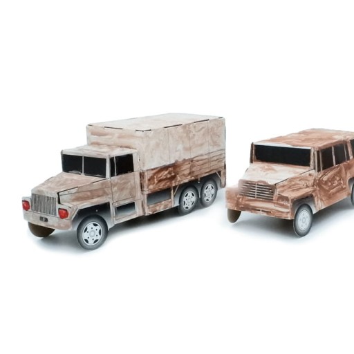 В упаковці: 2 моделі танків, 2 моделі військових машин, плакатні фарби, пензлик, інструкція на зовнішній стороні коробки.