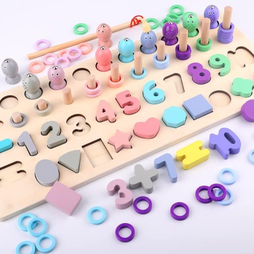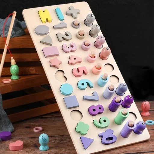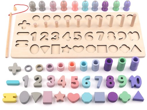 Серед багатьох елементів сортера ви знайдете різнокольорових рибок з магнітами, яких потрібно ловити за допомогою вудки, також оснащеної магнітом.