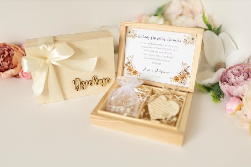 Унікальний сувенір для кумів, який прикрашений ніжною стрічкою та дерев'яним написом "Спасибі".