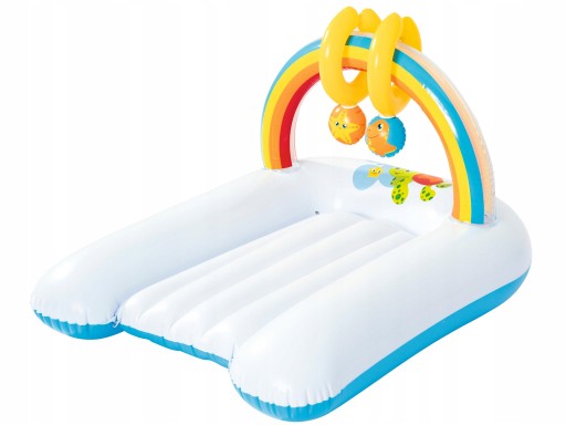 Портативний надувний пеленальний столик забезпечить зручне і легке переодягання вашого малюка під час довгих вихідних або відпустки. У складеному вигляді він легкий і не займає багато місця в сумці, тож його можна брати практично куди завгодно. Пеленальний столик виготовлений із твердого, перевіреного вінілу та має запобіжні клапани. Для більшого комфорту малюкові дно пеленального столика надувне. Іноді буває важко переконати дитину лежати спокійно, особливо коли вона втомлена після подорожі. Тому над пеленальним столиком дитина знайде коробку з двома скрипучими іграшками. Цікаві та насичені кольори неодмінно привернуть увагу вашого малюка.
