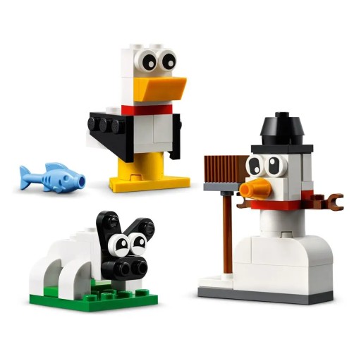 Цікава колекція білих кубиків LEGO надихне дітей будувати, творити та винаходити. У набір входять три прості, зразкові моделі, які можна створити, щоб допомогти вам почати творчу гру. Це сніговий сніговик із носиком, овечка на заквітчаному полі та чайка з рибою. Діти також можуть змішувати блоки та змінювати моделі по-своєму або будувати щось зовсім інше. Просто додайте трохи фантазії до цих багатофункціональних кубиків і елементів LEGO!