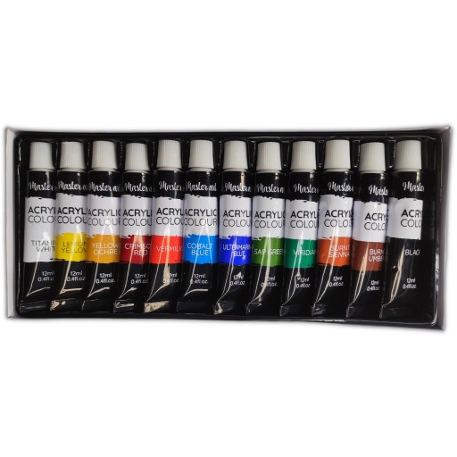 У наборі 12 тюбиків акрилових фарб.